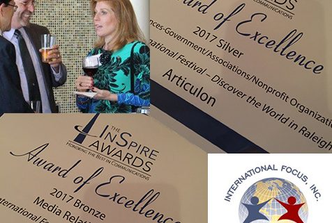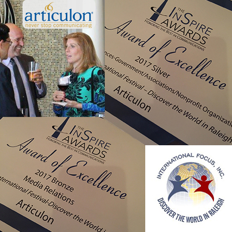 The first recognizes outstanding public relations tactics, know as a Bronze Inspire Award. Articulon received a Award of Excellence for media relations efforts for the 31st Annual International Festival of Raleigh. Judging was based on — planning/content, creativity/quality, technical excellence and results.
