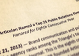 Brand communication and public relations firm Articulon announces today that the agency ranks among the Triangle’s top 25 public relations firms as reported by the Triangle Business Journal. This is the eighth consecutive year Articulon has received this recognition. Cindy Stranad, APR founded Articulon to offer expertise in public relations, brand messaging, design, social media…