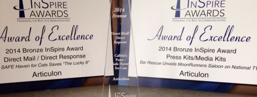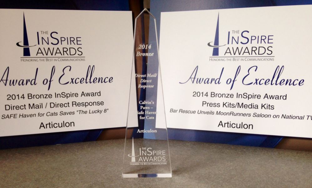 InSpire 1Articulon received three InSpire Awards from the North Carolina Chapter of the Public Relations Society of America. The agency was recognized for its work on behalf of MoonRunners Saloon and SAFE Haven for Cats during the sixth annual InSpire Awards banquet on May 7, 2014.