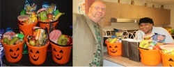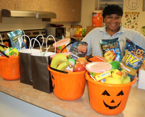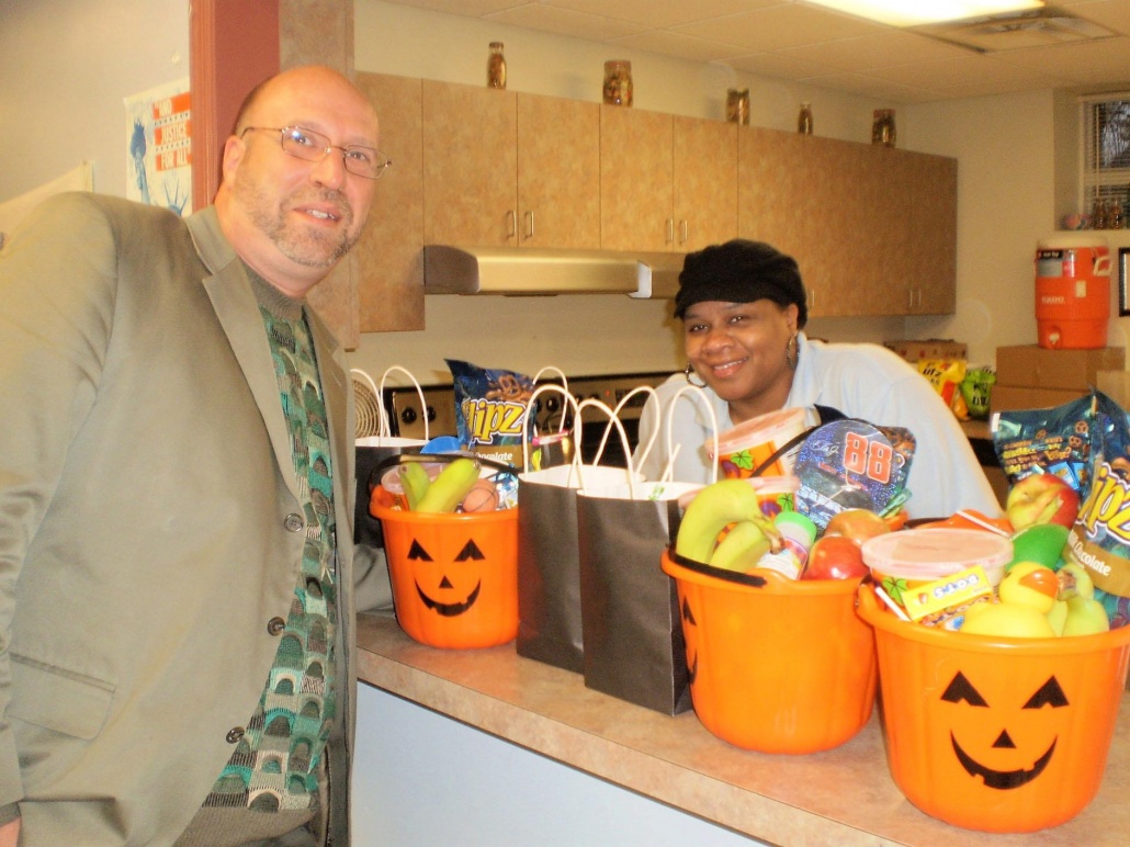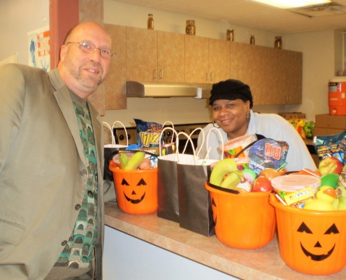 Mike and Cindy deliver Halloween goodie bags and trick-or-treat pumpkins to Passage Home’s Michelle Love and the children at the fall celebration.