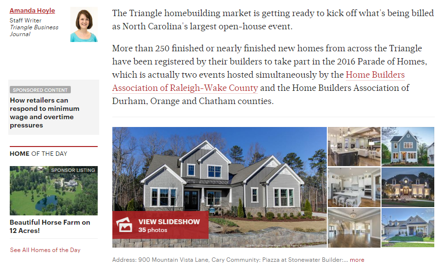 - Attained three print articles: New Home and Ideas magazine, Durham/Chapel Hill N&O, Triangle Business Journal.
