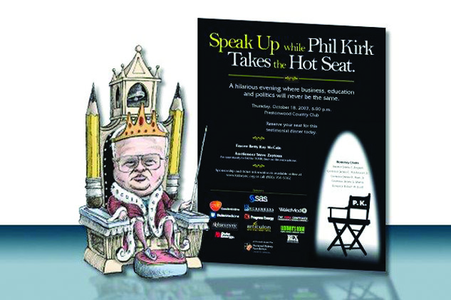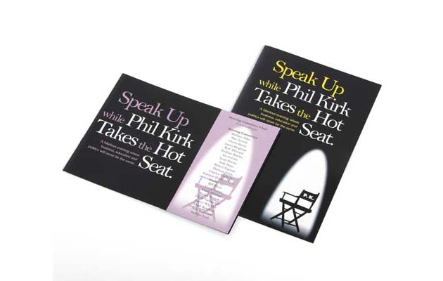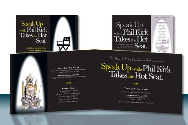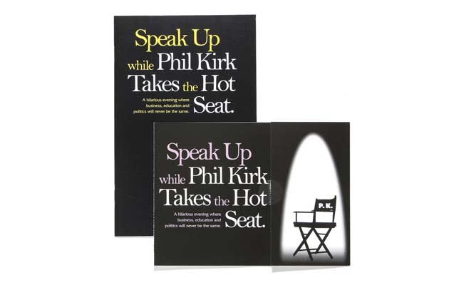 Developed the event theme “Speak Up while Phil Kirk Takes the Hot Seat” and tagline “A hilarious evening where business, education and politics will never be the same.”